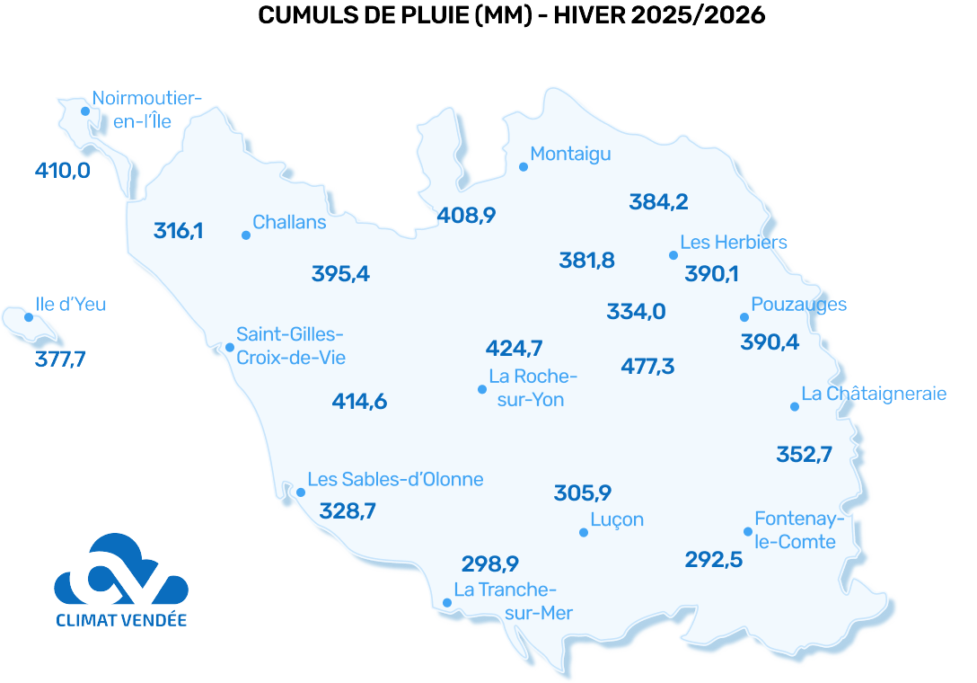 En effet, sur ces 3 mois d’hiver météorologique, on comptabilise un excédent de 30 à 60 % soit des cumuls de 300 mm des plaines du Sud Vendée vers le littoral vendéen, 400 mm pour les îles et le bocage vendéen, voire localement jusqu’à 500 mm. Il est donc tombé l’équivalent de la moitié de la quantité moyenne annuelle, et tout cela en 3 mois !